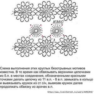 Крім цього, потрібно запам’ятати принципи. Перше правило, яке необхідно засвоїти при вивченні цієї техніки – перший мотив ніколи не довязывается до кінця, необхідно залишити останній ряд, так як саме з нього починається наступний мотив. Друге правило дуже очевидно – не можна обривати нитку при кінці в’язки мотиву, необхідно просто набрати повітряні петлі як це робиться при звичайній в’язці. Необхідно враховувати, що другий мотив приєднується до першого, а останній недовязанный ряд з повітряними петлями другого мотиву служить для початку третього. За цим же принципом в’яжуться і всі інші мотиви, які можуть тривати до нескінченності.