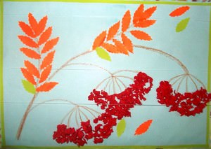 Дуже гарною і оригінальною виходить аплікація «Гілка горобини». Цікаво, що дана виріб із серветок для дітей включає в себе відразу дві техніки. Перша частина малюнка створюється з паперових заготовок, а друга — з грудочок. Впоратися з такою аплікацією вдасться навіть дитині старше 5 років. Для її створення потрібні такі матеріали та інструменти: