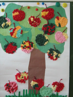 Існує і безліч варіантів аплікацій з серветок для дітей, які дозволяють створити на аркуші паперу красиве пишне дерево. А допоможуть їм у цьому тематичні майстер-класи. Найцікавіше працювати над яблунею. Для її створення потрібні такі матеріали та інструменти: