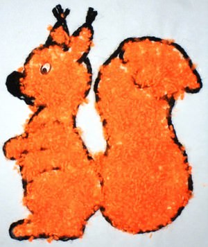 Після цього потрібно просто відривати від паперу маленькі шматочки і скачувати їх у тугі кульки. Білі деталі підійдуть для оформлення нижній частині мордочки, животика, кінчика хвоста і лапок, а помаранчеві — для всього іншого силуету. Залишиться лише наклеїти їх у відповідні області картинки. Чим крупніше вийдуть кульки, тим об’ємніше і «пухнасті» в підсумку виявиться білка. Очі і ніс тварини можна намалювати чорним маркером. Якою буде білка, залежить лише від фантазії і переваг самих майстрів. До речі, така руда красуня або будь-який інший персонаж стане відмінним прикрасою саморобної листівки. А якщо серветку розрізати на маленькі квадратики, але не скачувати їх у кульки, а просто приклеїти на шаблон за серединку, так , щоб кінчики стирчали вгору, і утворили пишну шерсть білочки, то така техніка називається — торцювання.