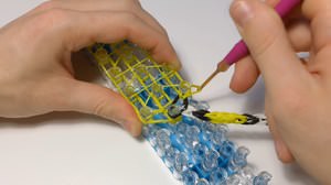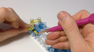 - Таким способом продовжимо плести до закінчення правого рядка. Потім просмикнемо гачок крізь усі резиночки всередину стовпця, на якому ви закінчили плести. Притримуйте резиночки на гачку пальчиком і знімемо всі гумки з правого ряду. Петлі, які залишилися на гачку, натягуємо на найближчий до вас стовпець центрального рядка.