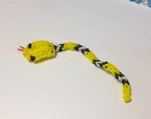 Кінцеву пару резинок з цього стовпчика перетягуємо на 6 стовпчик ряду з центру. Потім послідовно сплітаємо лівий рядок, правий ряд і центральний ряд тим же способом, що й раніше, тобто знімайте резиночки з кожного стовпця і перетягуємо їх попереду. Завершити плетіння кожного рядка треба на першому стовпчики центрального ряду. Створіть мова для змії з матеріалу червоного кольору. Заведемо гачок в перший стовпець ряду з центру крізь всі гумки. Зацепим червону резиночку, протягуємо через всі резиночки і затягнемо її вузлом. Готове, ось ми і дізналися, як сплести змійку! Можна, звичайно, зробити таку саморобку з допомогою рогатки, але робота буде складніше.