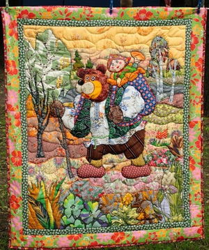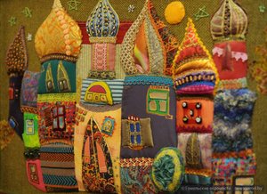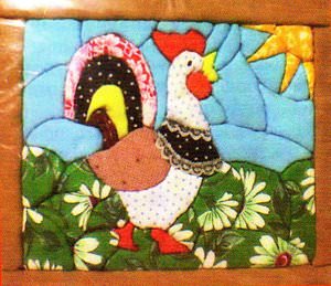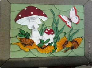 Вирізаємо шматок тканини будь-якої форми, який вам подобається. Зручніше зробити прямокутну або квадратну картину. Малюємо або копіюємо обраний візерунок. По малюнку робимо аплікацію з обрізків тканини. Їх можна пришивати на швейній машинці обметочным швом. Коли малюнок готовий, по периметру обшиваємо фон смугою тканини контрастного кольору шириною 3-4 див. Шов, що з’єднує рамку і фон, можна зашити стрічкою або стрічкою в тон рукоділлю.